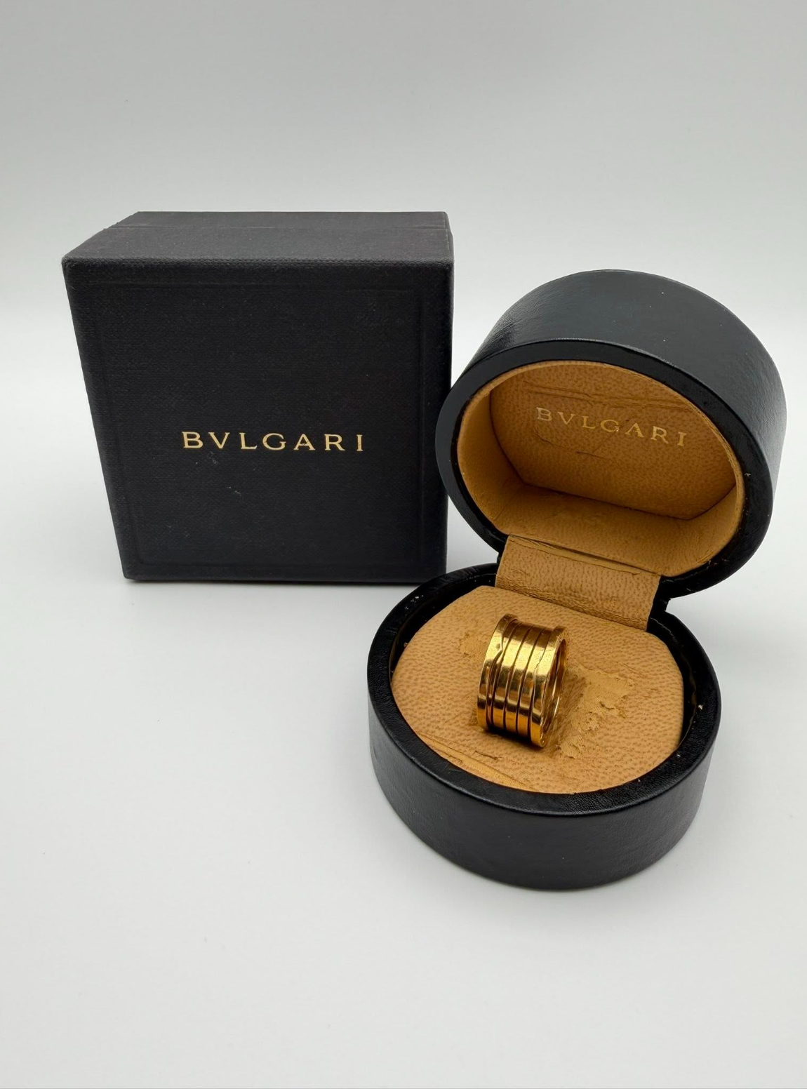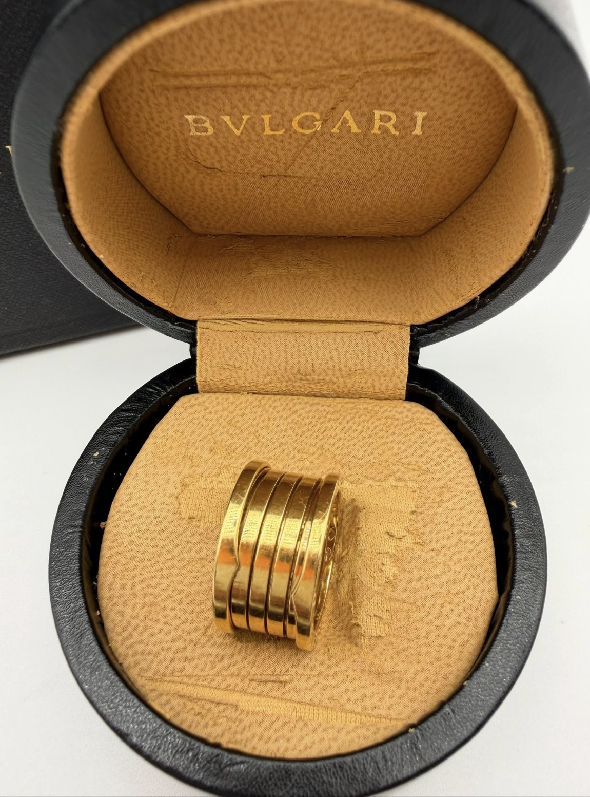 Description: For sale is a stunning and iconic Bvlgari B.zero1 Five-Band Ring. This is the widest version of the celebrated B.zero1 collection, featuring a bold, architectural spiral design inspired by the Colosseum in Rome. Crafted in solid 18-karat Yellow Gold, this piece makes a powerful statement.