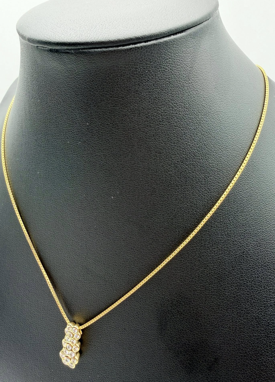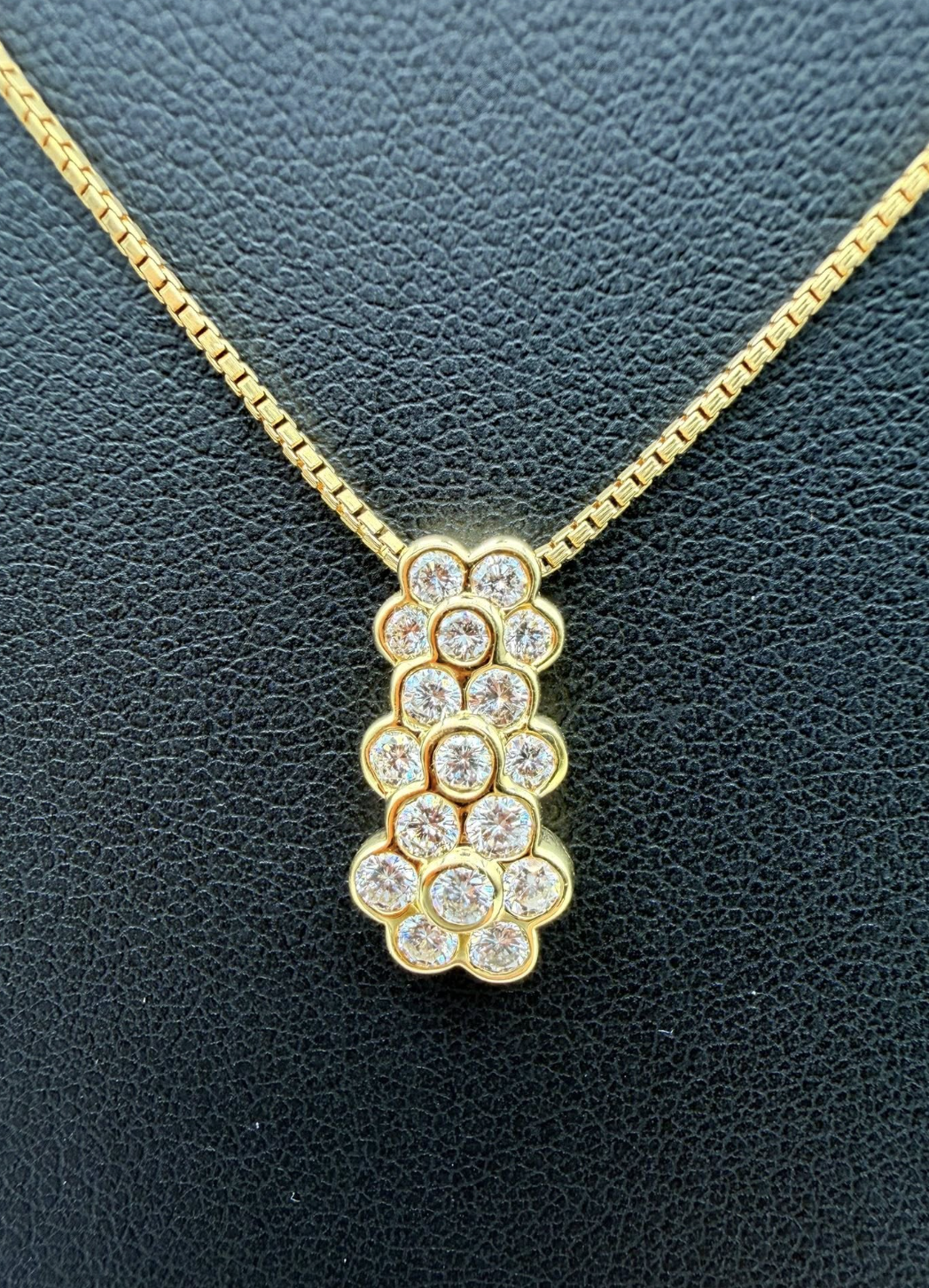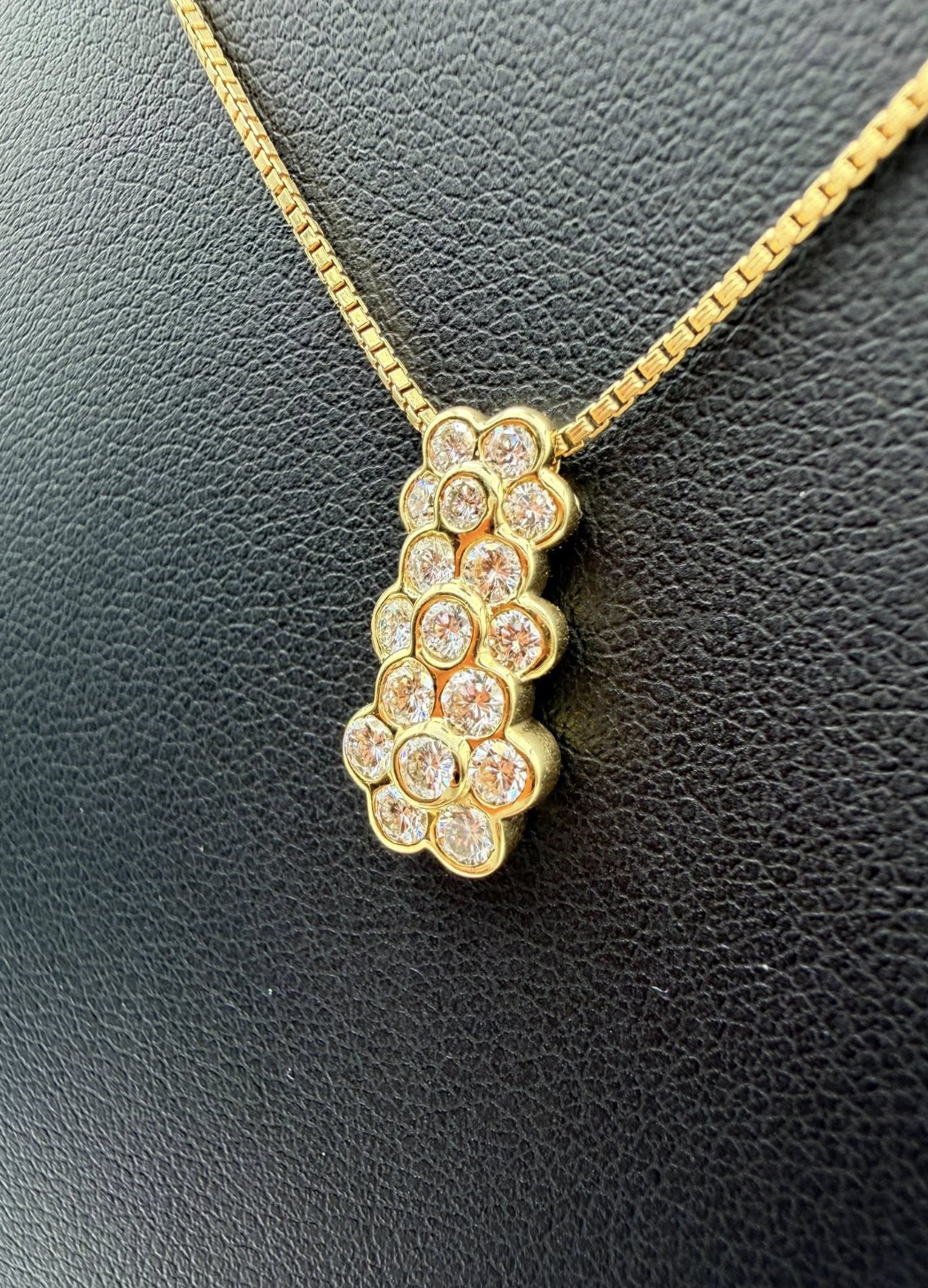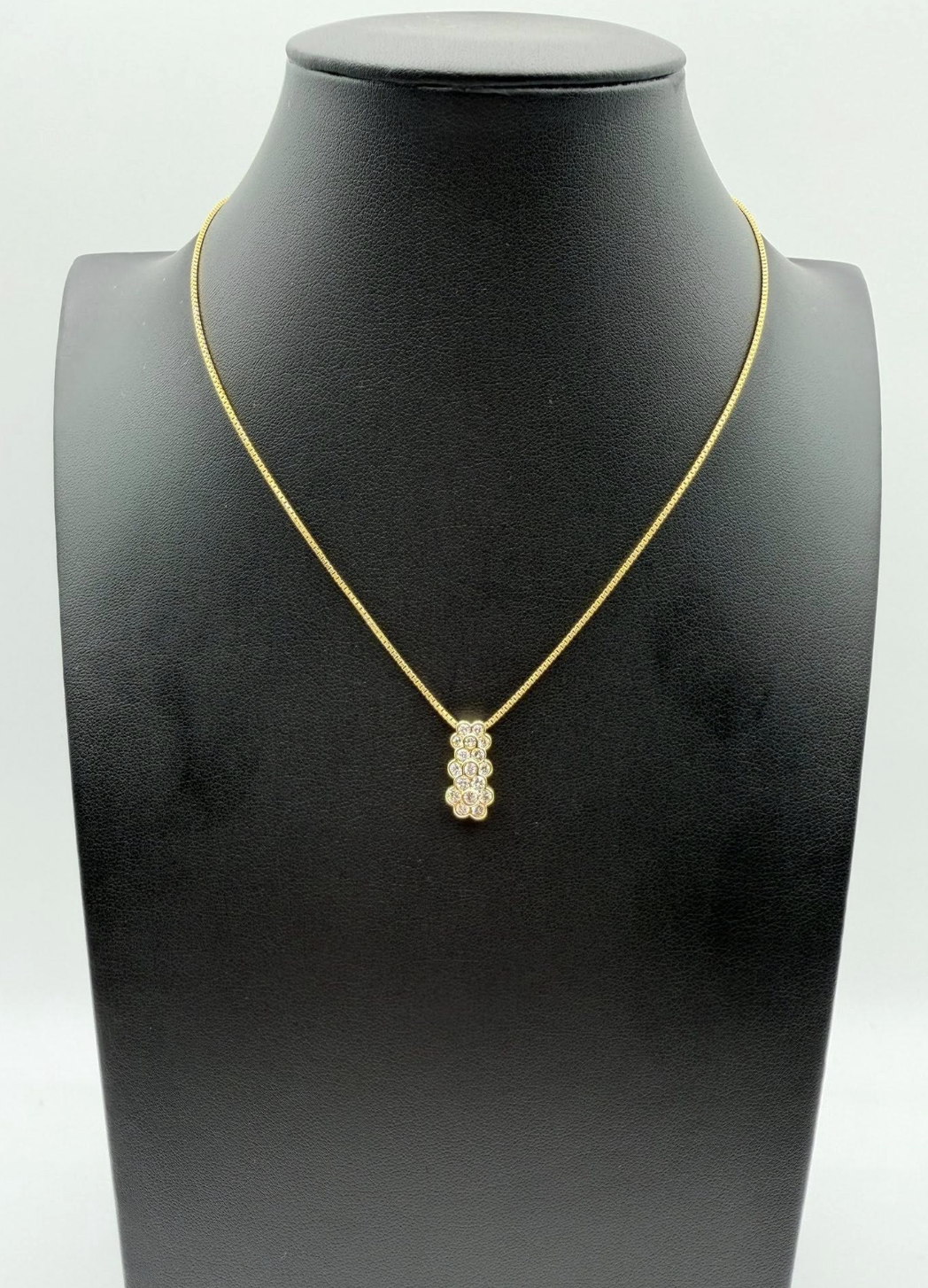 Design & Features The centerpiece is a sleek, vertical pendant featuring a significant 0.70 carats of natural, round brilliant-cut diamonds. These diamonds are seamlessly set in interlocking gold bezels, creating a continuous "bubble" or cluster effect that maximizes fire and brilliance.