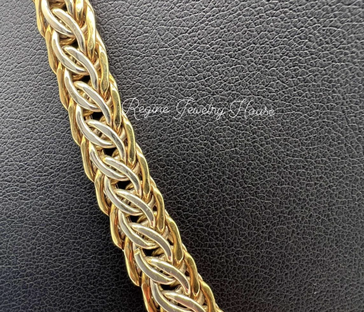 Up for sale is a stunning and substantial K18 gold necklace. This piece features an intricate woven design (similar to a Wheat or Spiga chain) that reflects light beautifully and sits comfortably on the neckline.