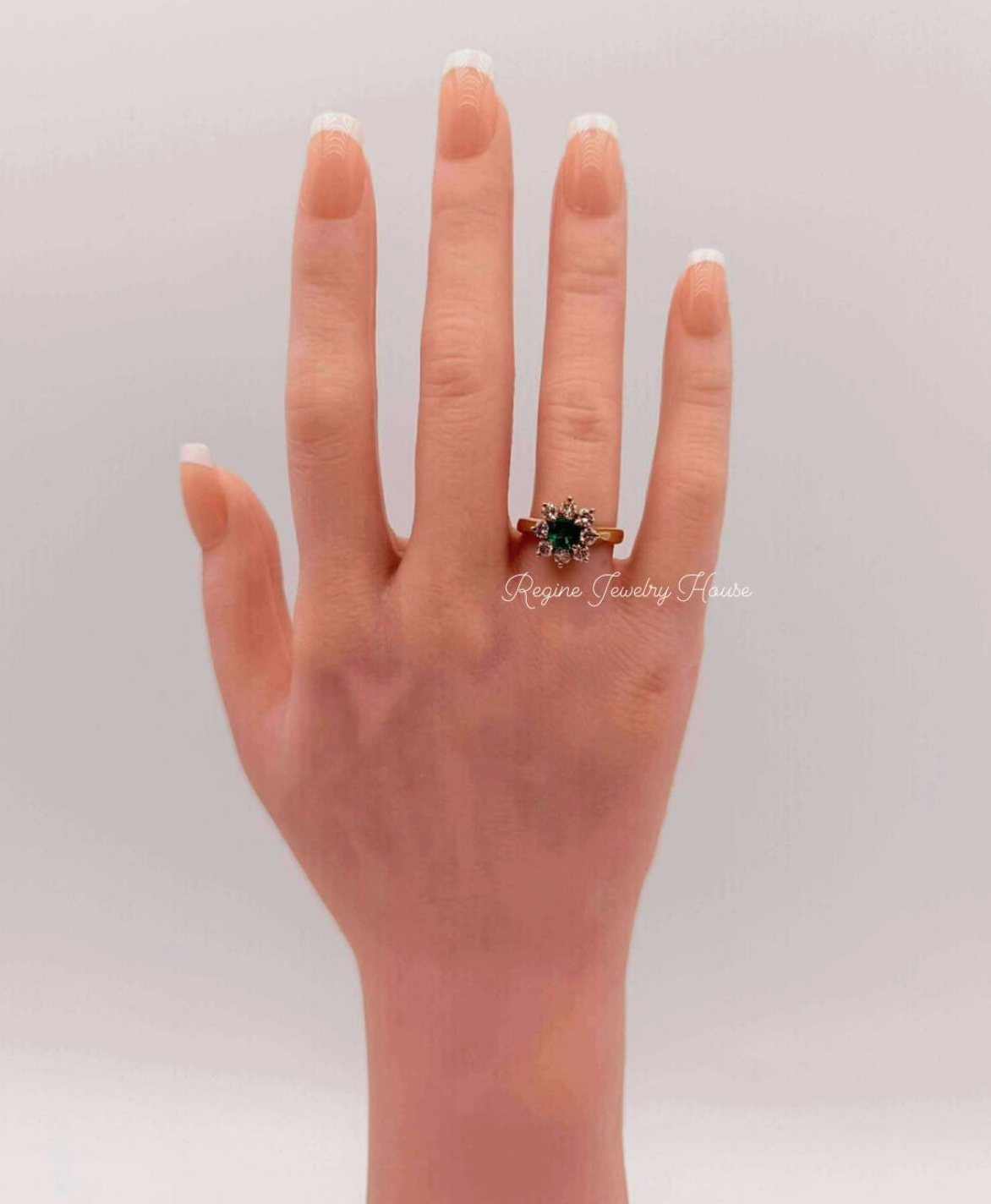 The central emerald displays a rich, vibrant green color that contrasts magnificently with the brilliant white diamonds and the warm yellow gold setting. The flower-like cluster design gives it a timeless, elegant look.
