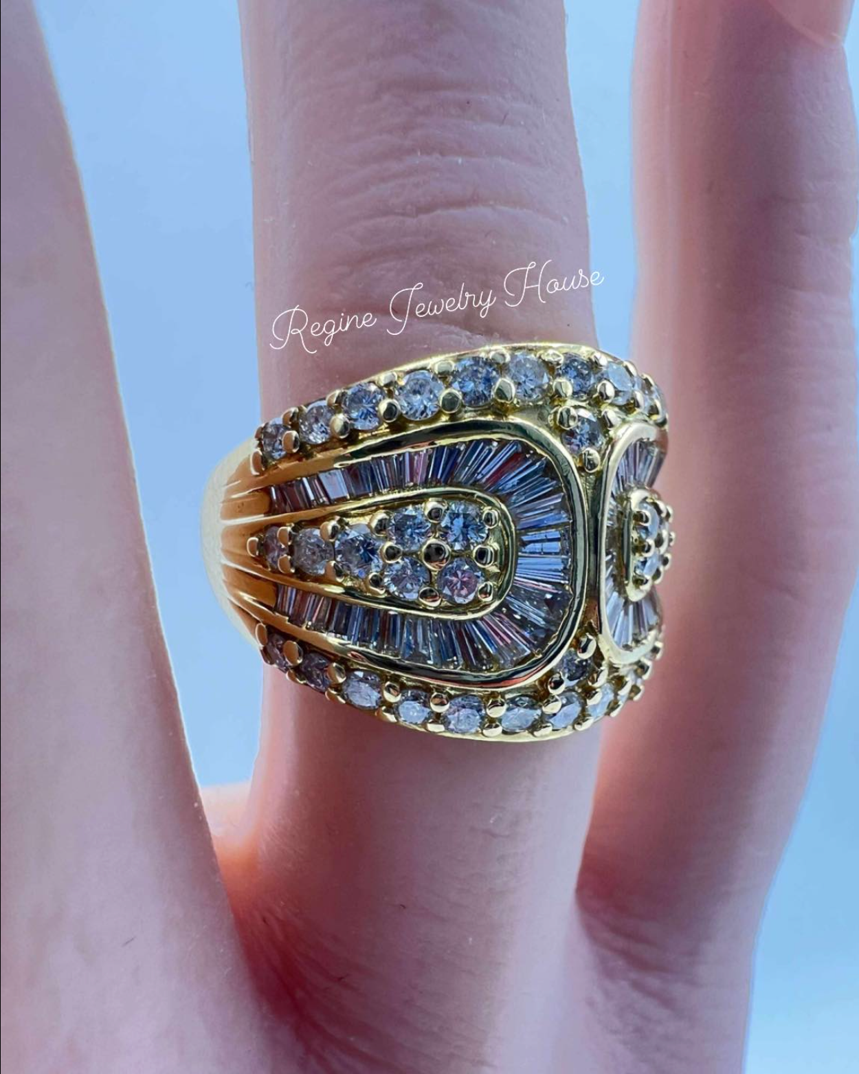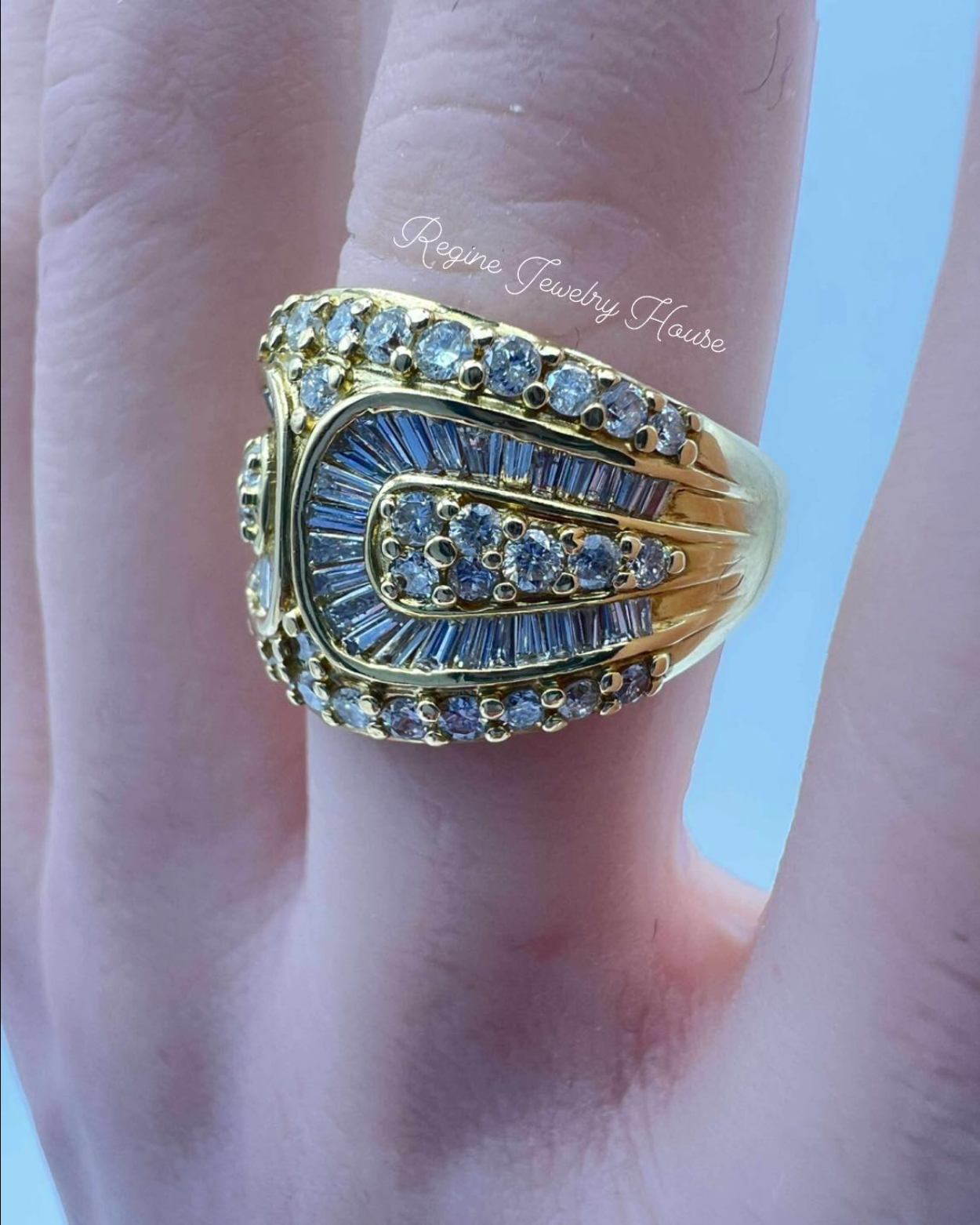 The ring is lavishly set with a total of 2.00 carats of natural diamonds. The design masterfully combines sparkling round brilliant cut diamonds with sleek tapered baguette diamonds. This combination creates a sophisticated contrast in brilliance and texture, mimicking the fabric and hardware of a belt.
