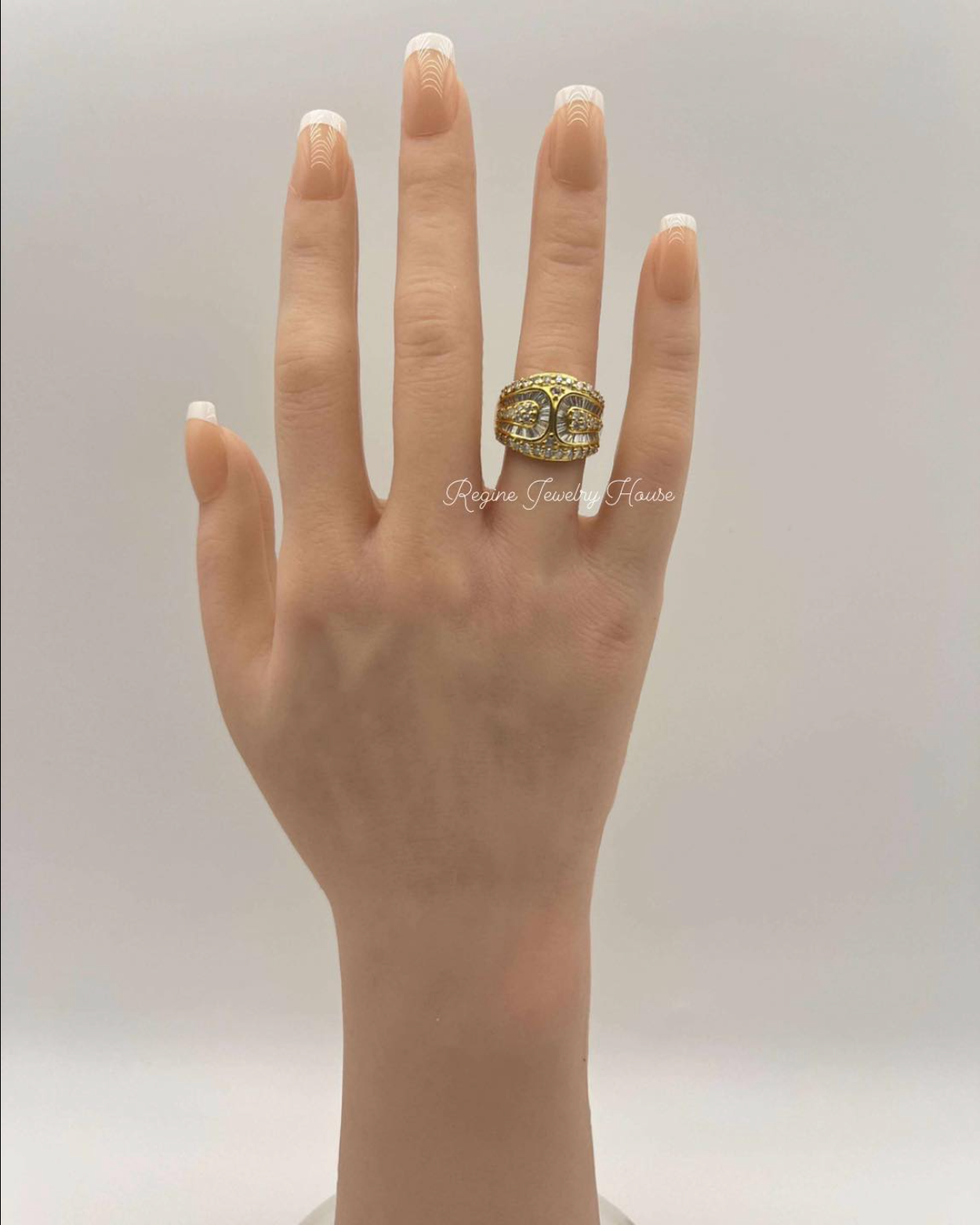 Weighing 8.8 grams, this ring has a substantial, high-quality feel and sits comfortably on the finger with a strong presence. It is an elegant statement piece suitable for both daily luxury and special occasions.