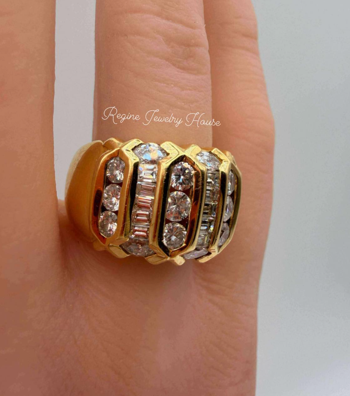 Design & Appearance This wide, high-domed ring features a sophisticated ribbed design. The face of the ring is composed of alternating vertical columns of diamonds set within a heavy 18K gold framework. The columns showcase a brilliant mix of diamond cuts: