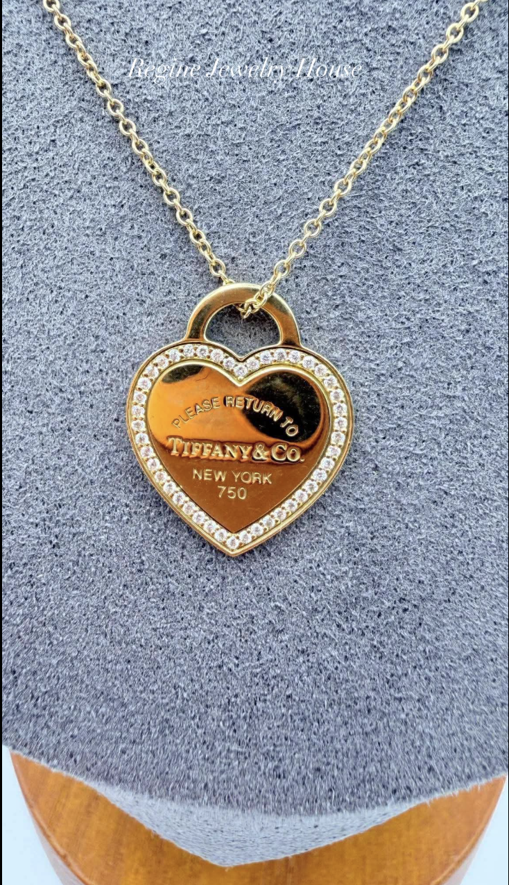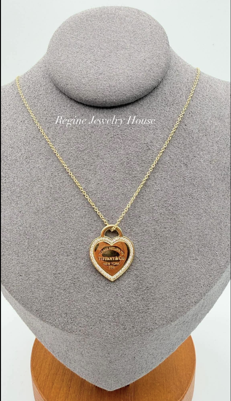 This elegant necklace features Tiffany’s iconic Return to Tiffany heart motif, crafted in 750 yellow gold and accented with a delicate diamond-set heart border. The pendant is suspended from a fine 40 cm chain, creating a refined and timeless look that is perfect for everyday wear or layering.