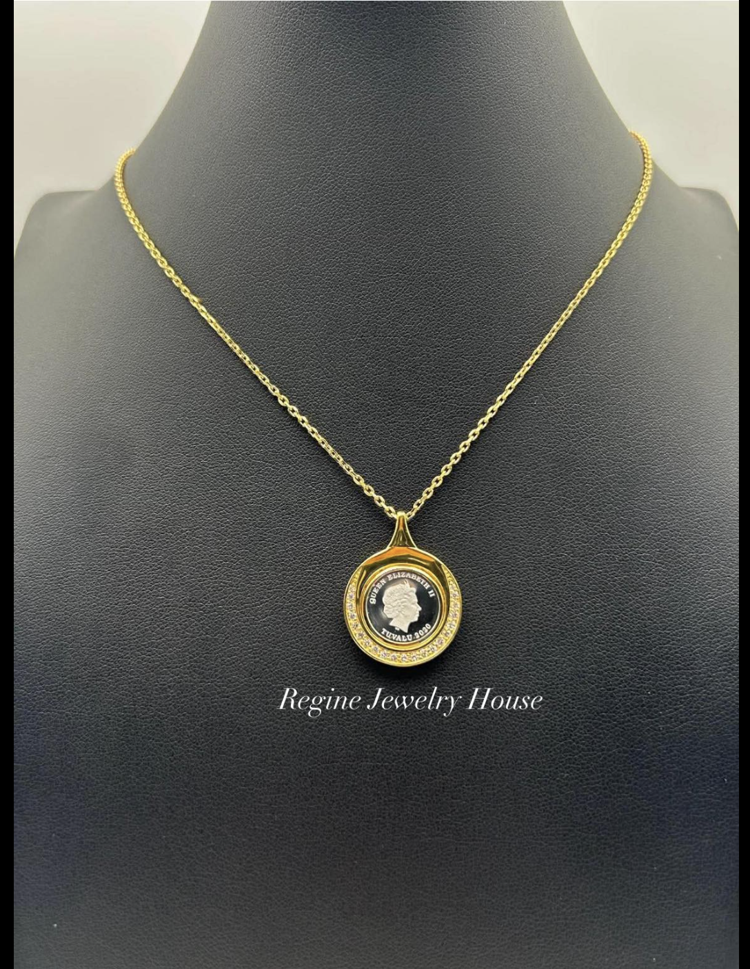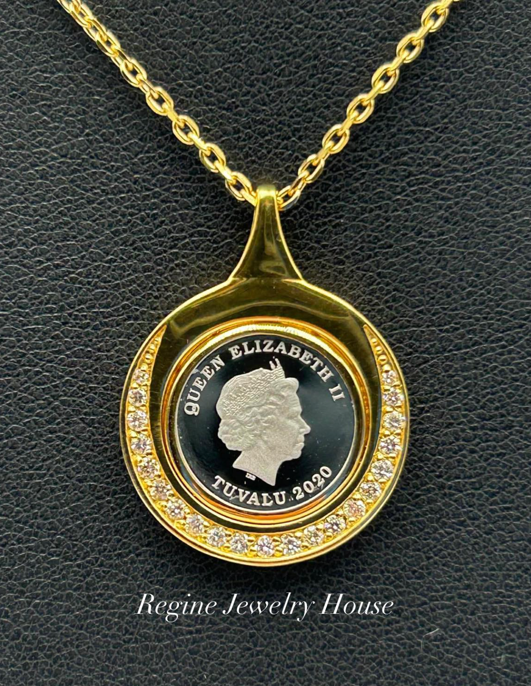 The pendant showcases a beautifully detailed coin design, combining luxury jewelry craftsmanship with collectible appeal.