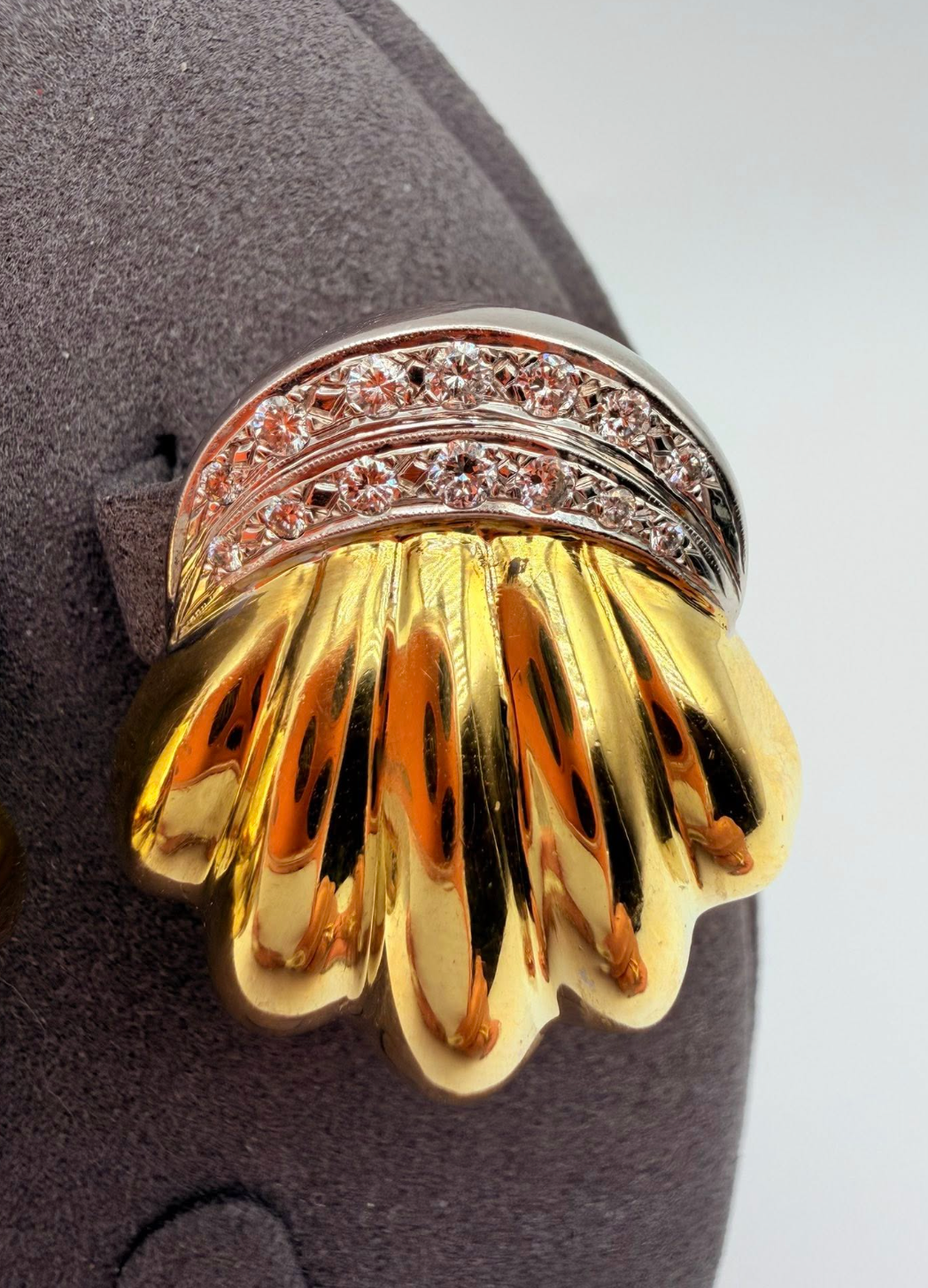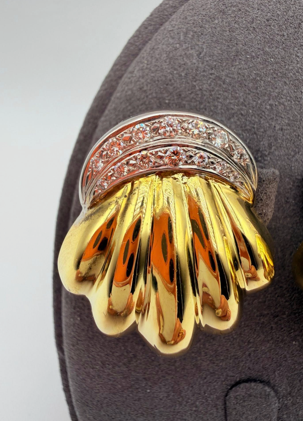 Design & Features These earrings feature a bold, sculptural fluted shell (or scalloped fan) design. The main body is crafted from high-polished 18K Yellow Gold (K18 YG), creating a warm, reflective gleam. The crest of the design is accented with a contrasting white metal band (likely Platinum or White Gold), which is elegantly pave-set with natural diamonds.