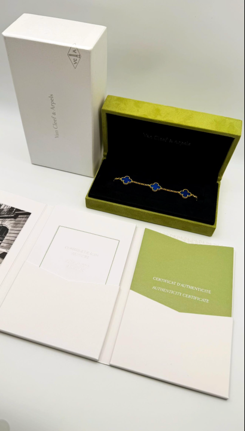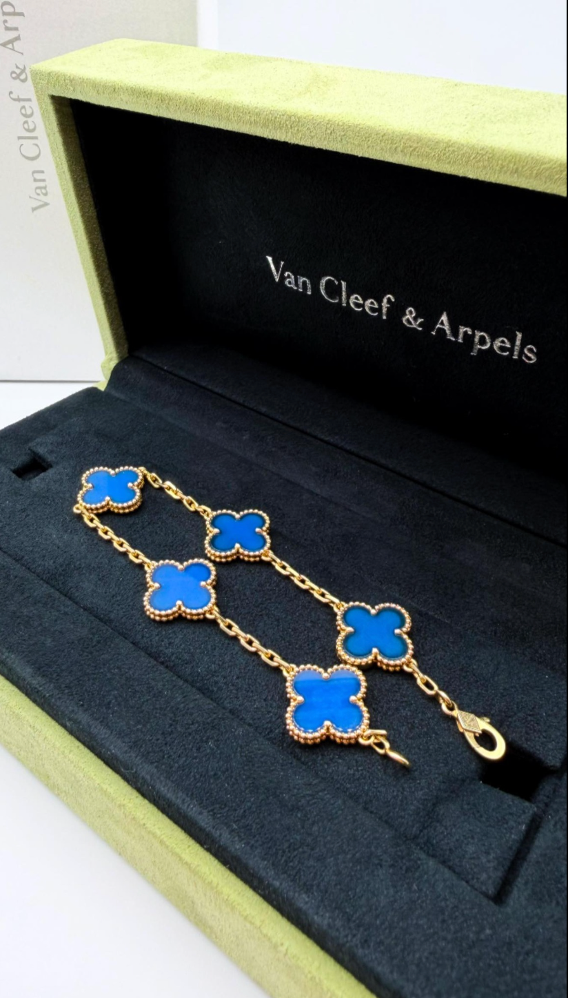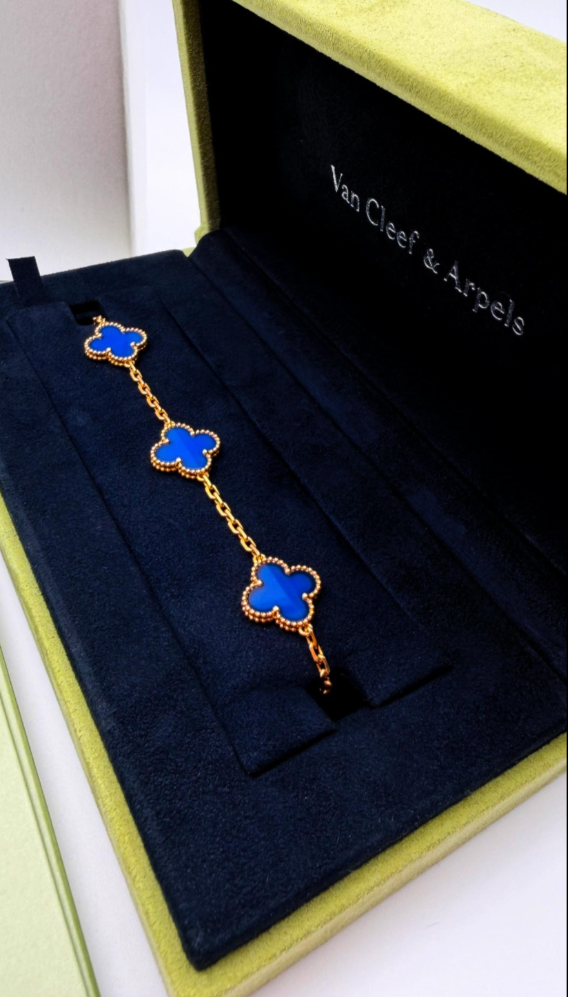 Capture a timeless symbol of luck with this stunning Van Cleef & Arpels Vintage Alhambra bracelet. Featuring five iconic clover motifs, this piece showcases the rare and captivating Blue Agate—a stone celebrated for its deep, translucent cerulean hues. Set in radiant 18K Yellow Gold with the signature beaded border, this bracelet is the epitome of high-jewelry sophistication.